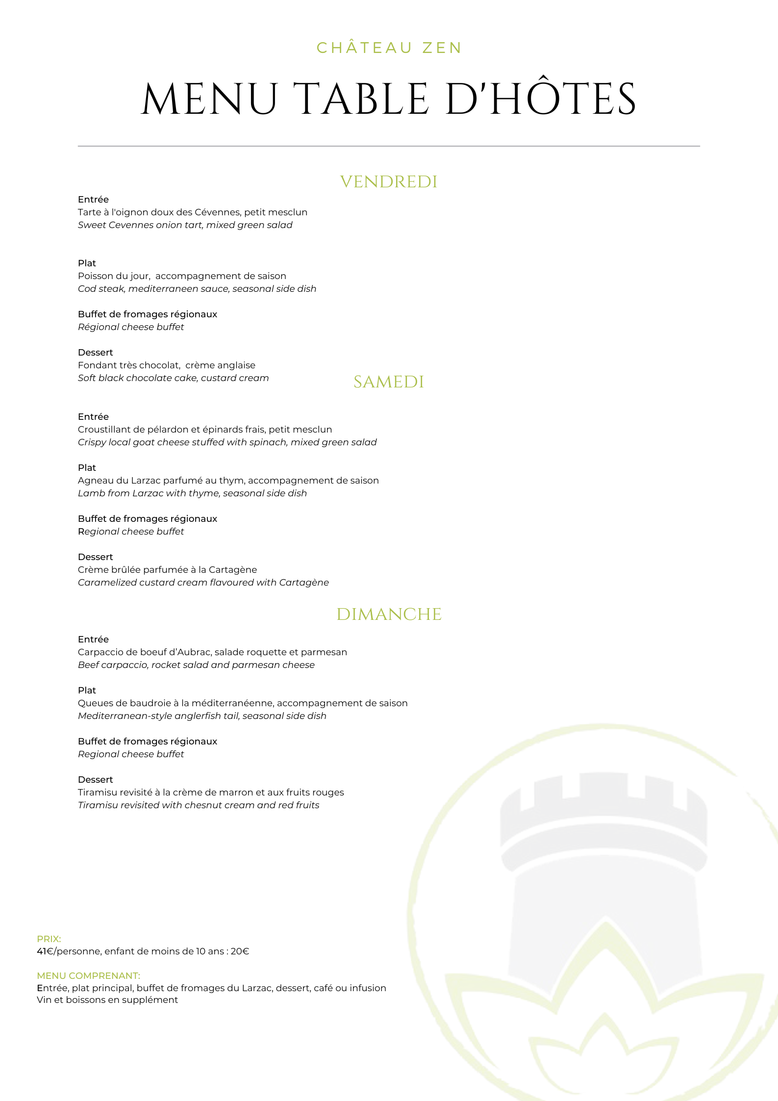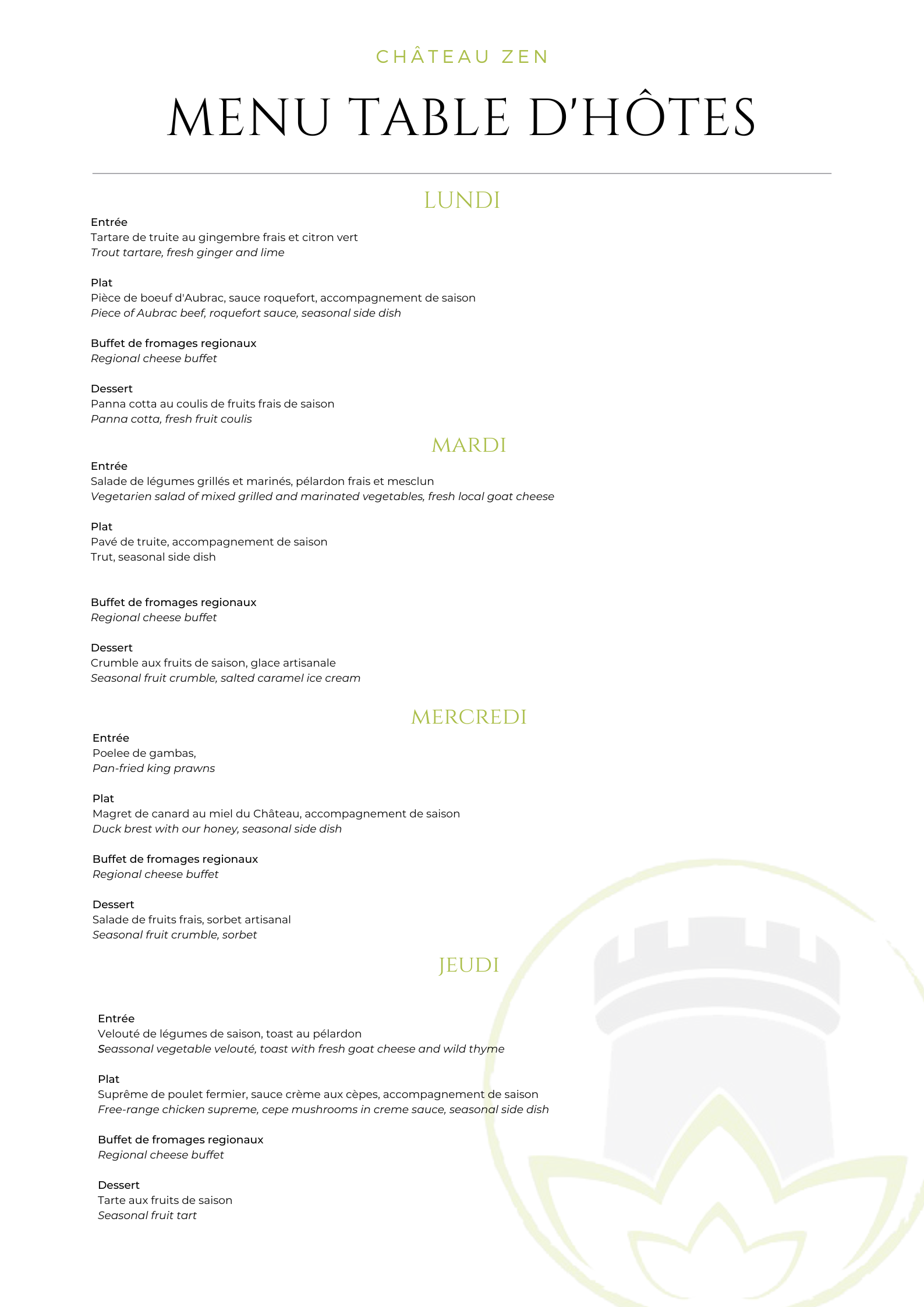 Tous les repas sont réservés uniquement à la clientèle, à réserver au moins 48h en avance (sous réserve de disponibilité).